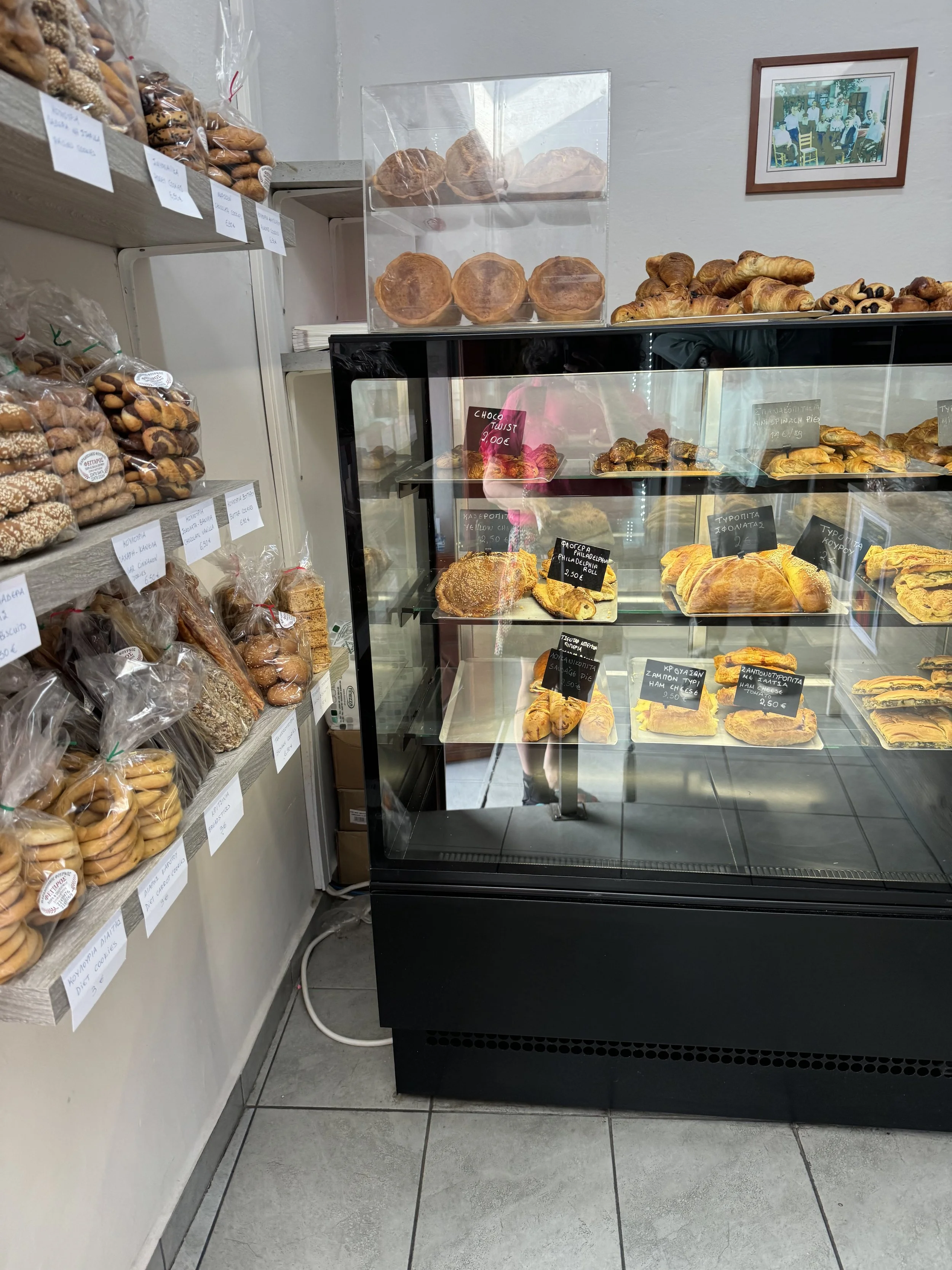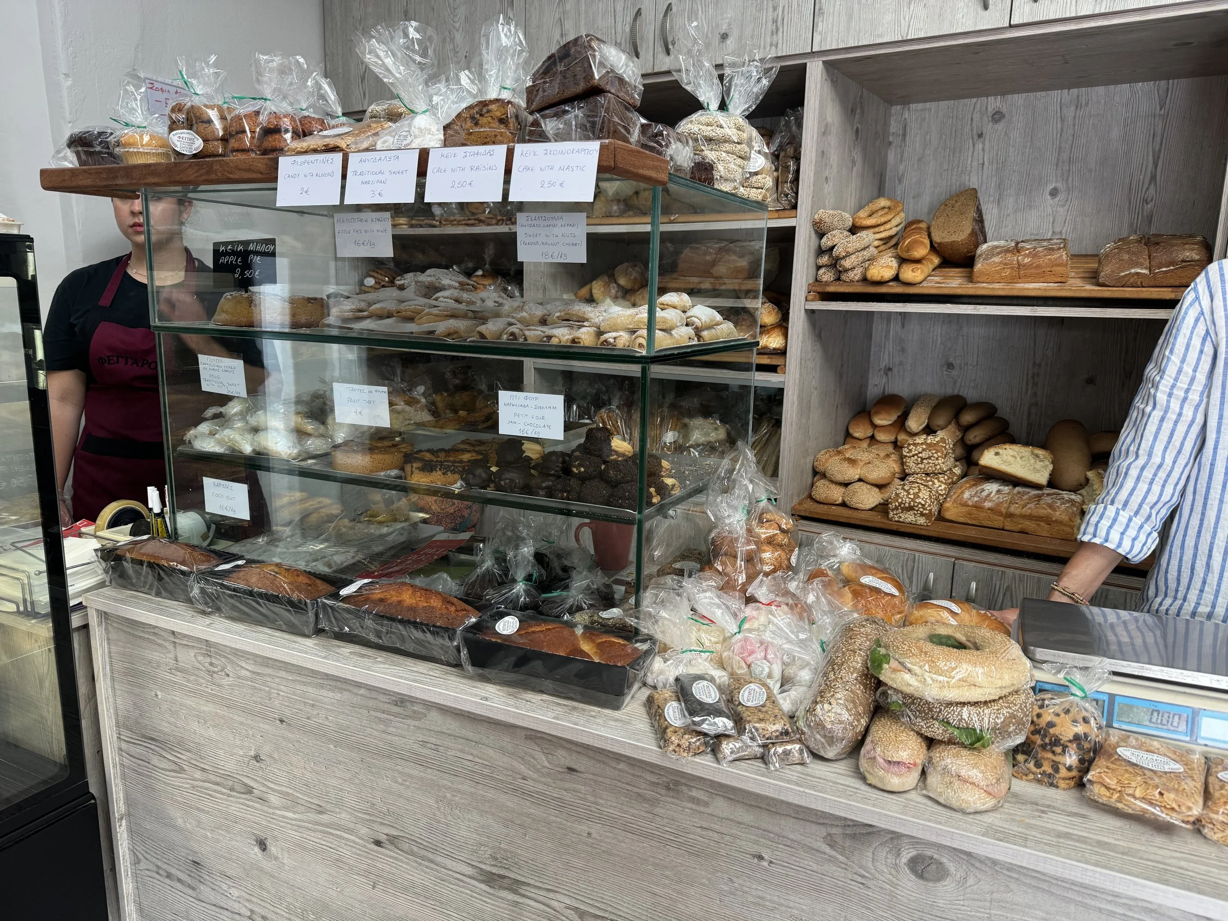 It would have all been quite healthy if not for our insatiable sweet tooth! Almost every day in Patmos we visited the bakery in Skala and got freshly baked pastries and gelato--bueno, tiramisu, cookies, and Ferrero Roche flavored. Sometimes twice a day. We usually had something sweet after every meal, not to mention other snacking.