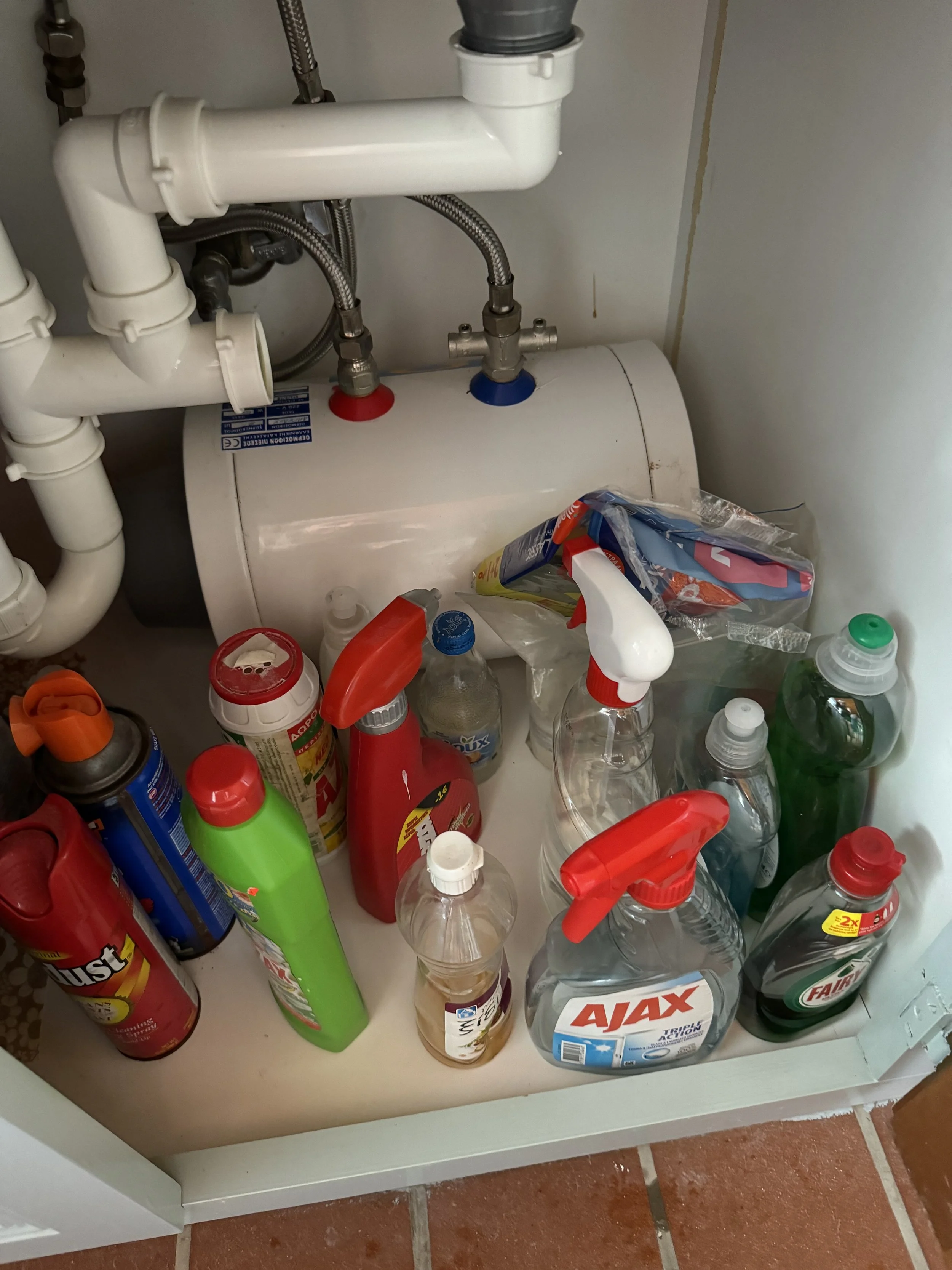 Cookie insisted on washing dishes because she said she enjoyed it. Also, she has learned how to conserve hot water, which is quite limited. Check out the hot water heater, which is kept just below the sink! Gets hot fast! But it doesn't last long!!