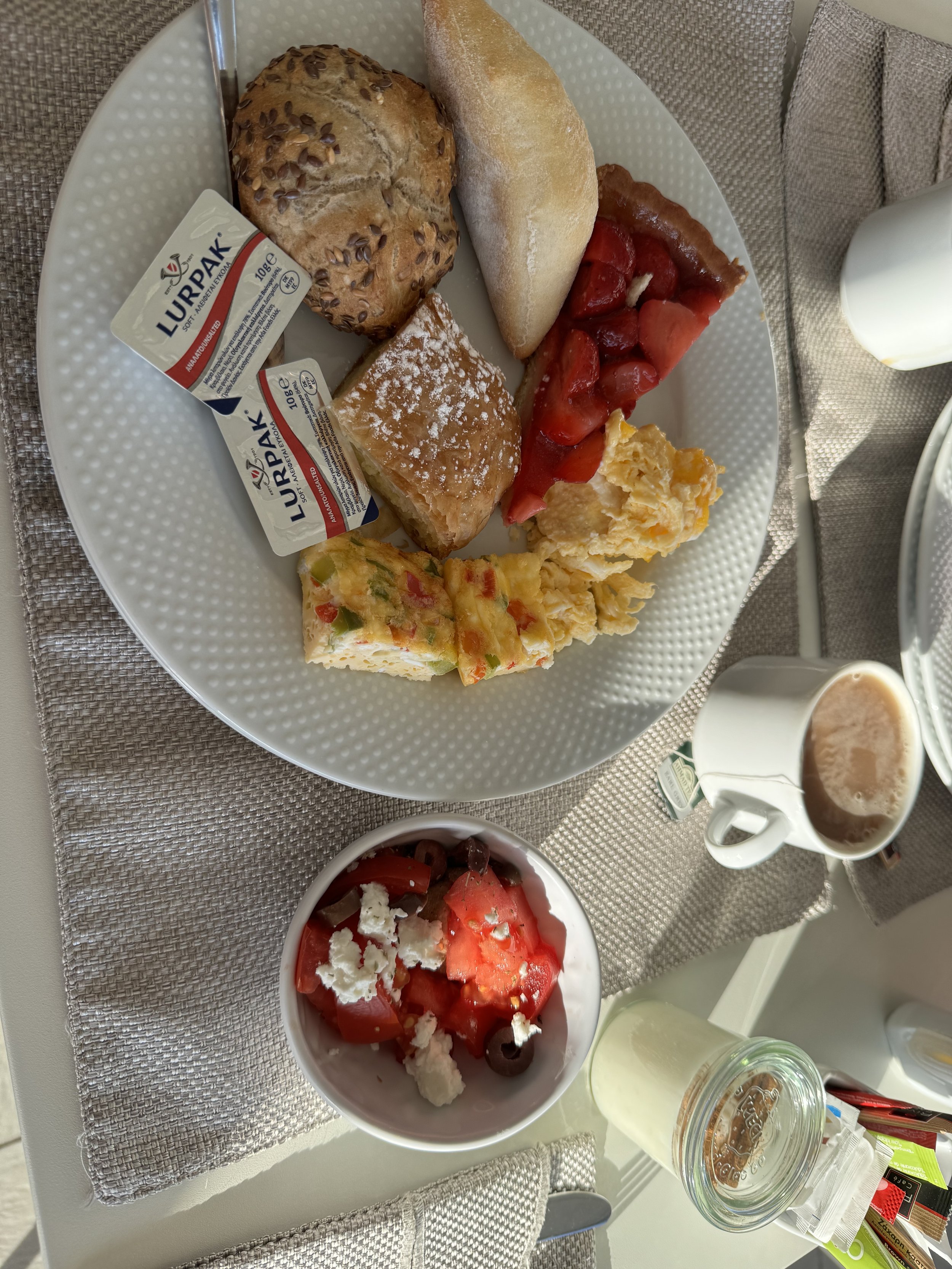 For breakfast most mornings, we walked down to the local bakery and bought fresh bread and bougatsa. Bougatsa is a Greek custard embedded between crispy buttery layers of filo dough, and then sprinkled with powdered sugar and cinnamon.