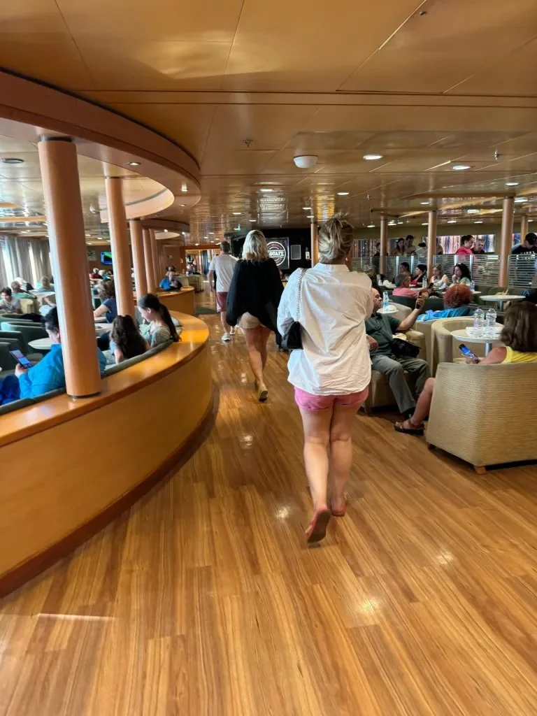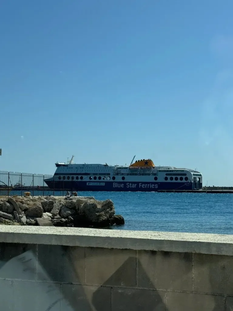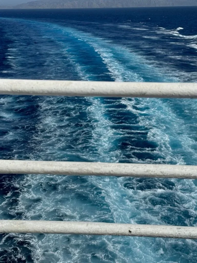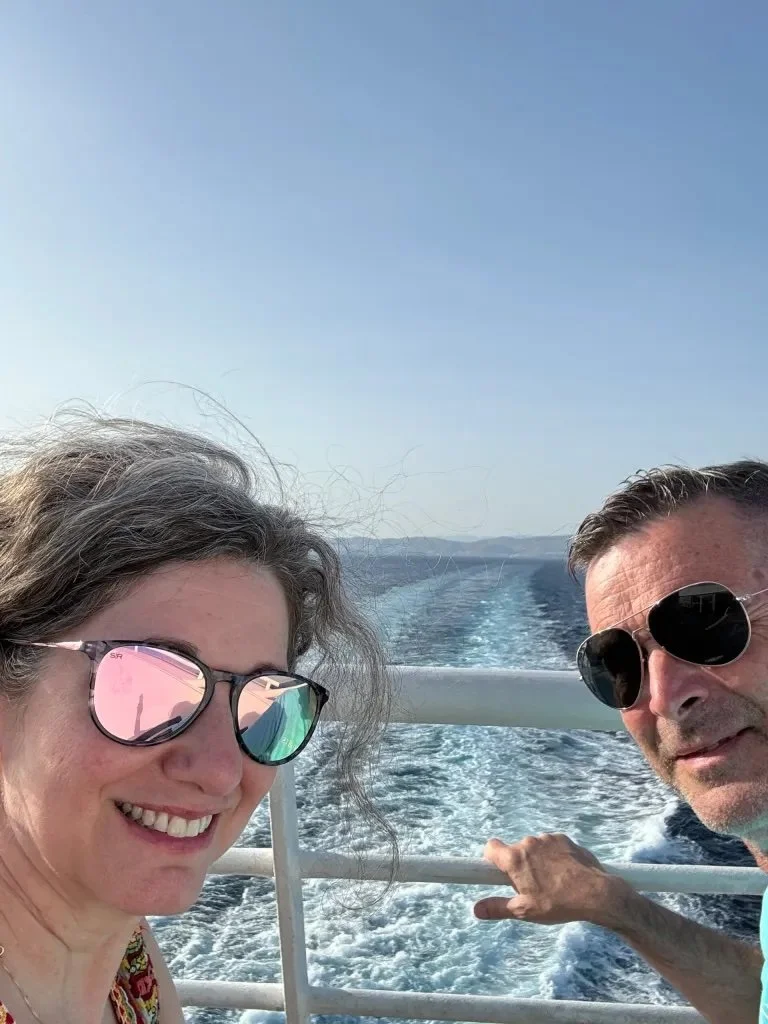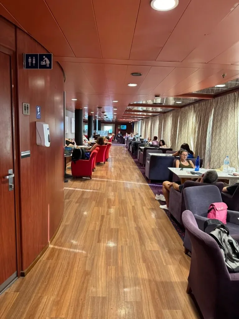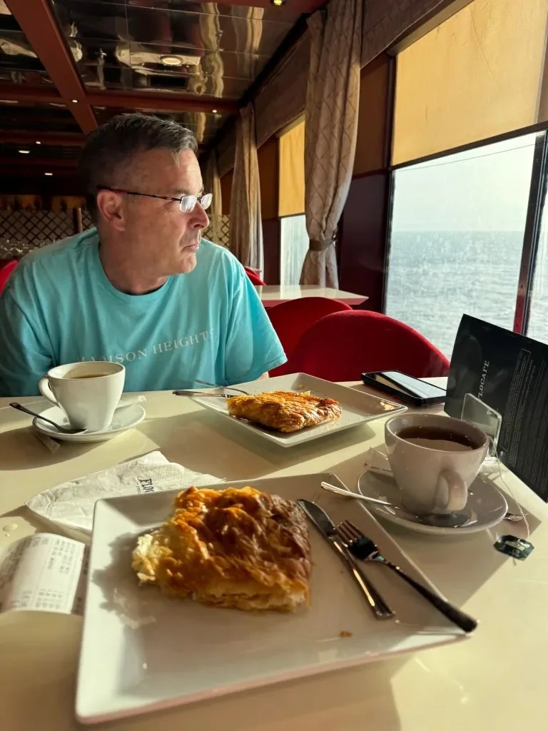 Wally and I have never been on a cruise, but traveling on the Blue Star Ferry felt a bit like we would expect that to be like. Except for all the people taking up almost every seat. Most of them spoke Greek and it occurred to us later that many of them may use the ferry regularly to visit relatives or friends on the islands.