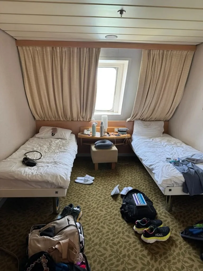 We were pleasantly surprised by our room, a “luxury suite” which instead of bunk beds had two twins and included an en-suite bathroom so we had our own toilet, sink and shower. All the rooms are on the 8th floor. Our room was 8102 and faced the front of the boat.