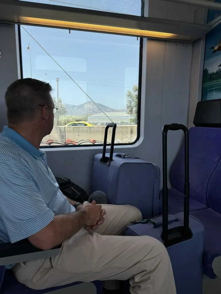 We began looking for signs for the bus and asked someone in a uniform for directions. He asked where we were going, and when we told him Piraeus, he said, “Oh, you should take the Metro. It’s less expensive and faster.” He went on to say, “The Metro will take about an hour to Piraeus, but the bus, with Athens traffic, use your imagination about how long it will take.”
