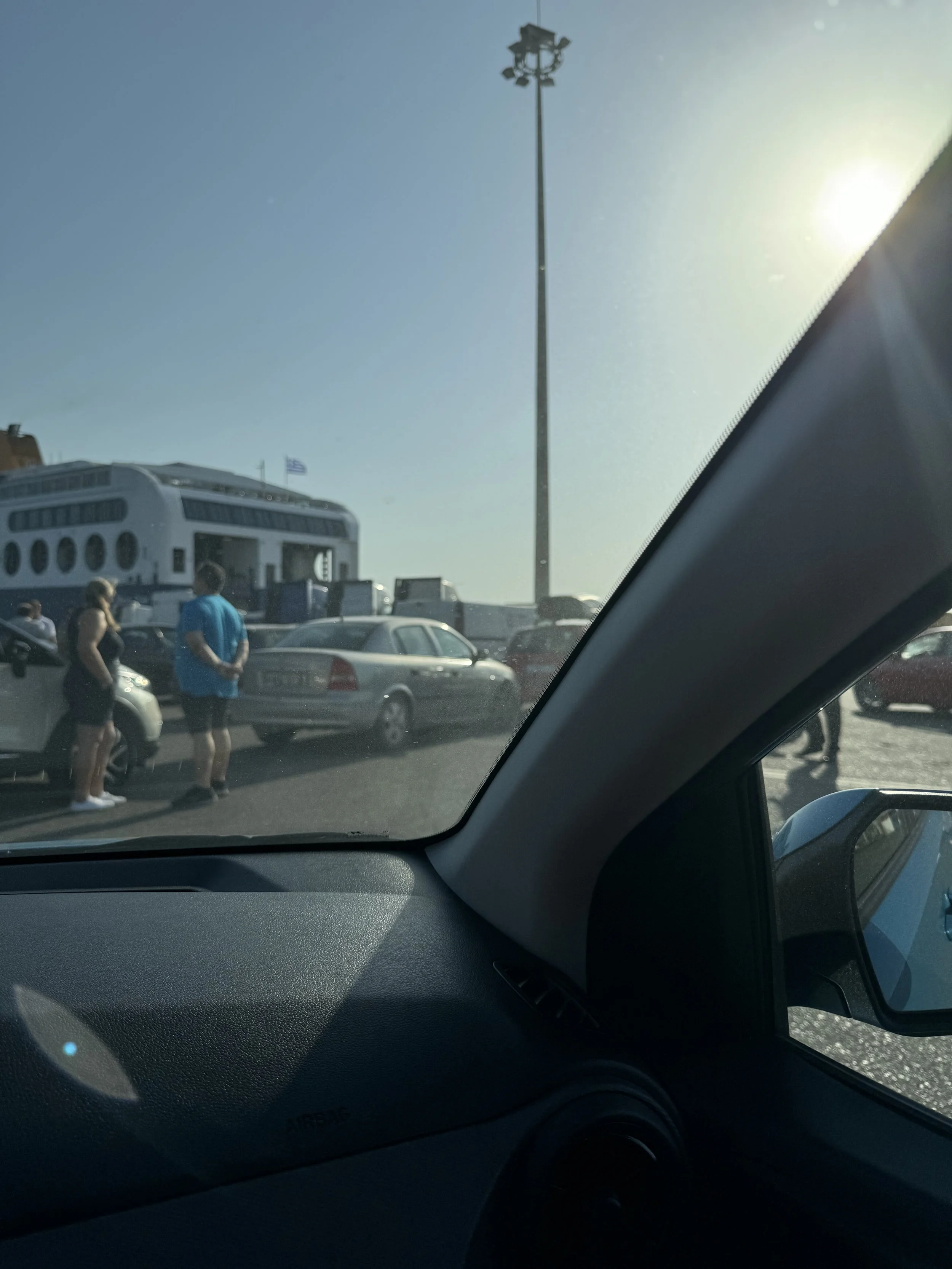 Soon, many more cars pulled in behind us and the other lines and then another guard began saying “Piraye-ee” to each driver including Wally. We had no idea what he meant and continued watching, discussing how they loaded and unloaded logistically, watching many 18 wheelers pull straight off the ferry as others pulled on, wondering how in the world they went in cab first and came out also cab first. How could they possibly have room to turn around???