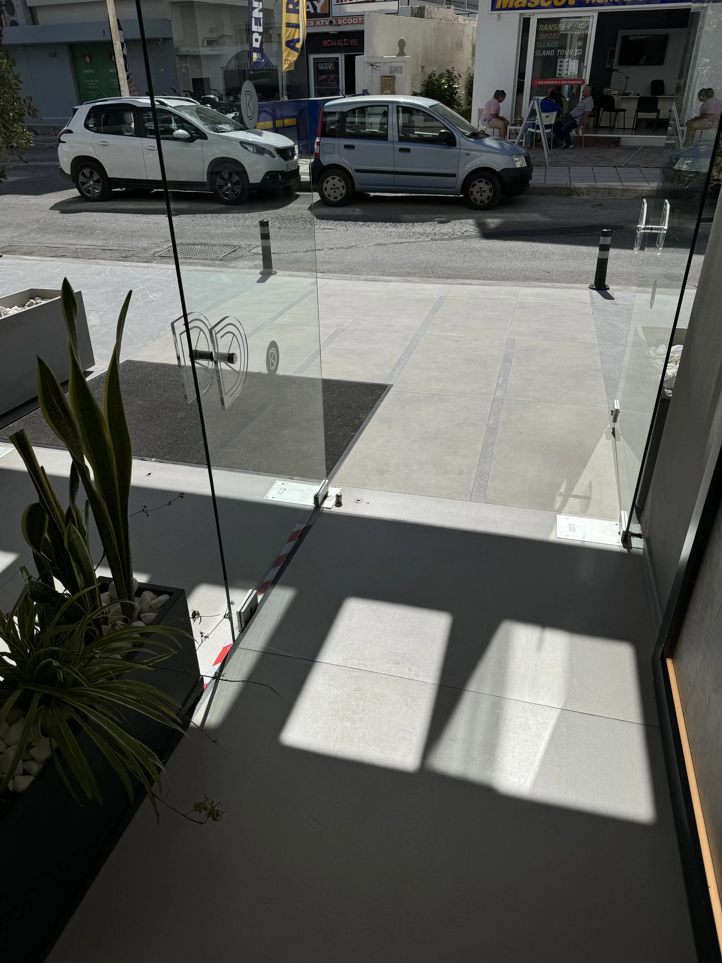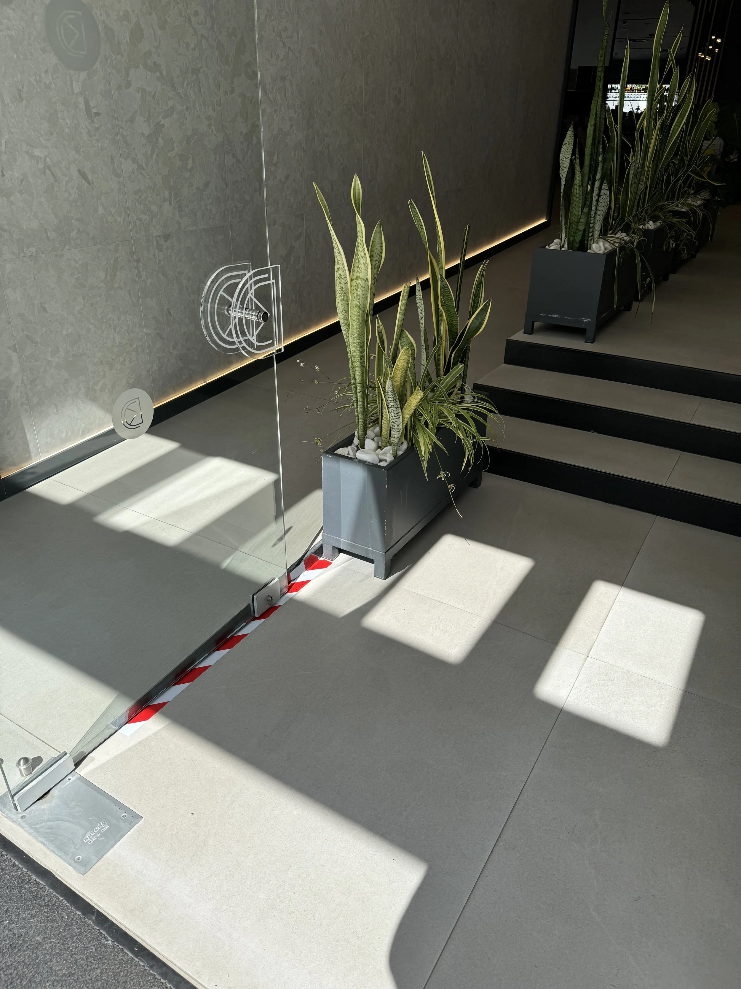 The front of the hotel has three glass doors. As I made my way to go out the one on the right, I noticed the one in the middle was standing open outward, so I decided to go through it so I could close it on my way out. (That red and white tape in the above picture had not been put down at that point, but was added by the next morning.)
