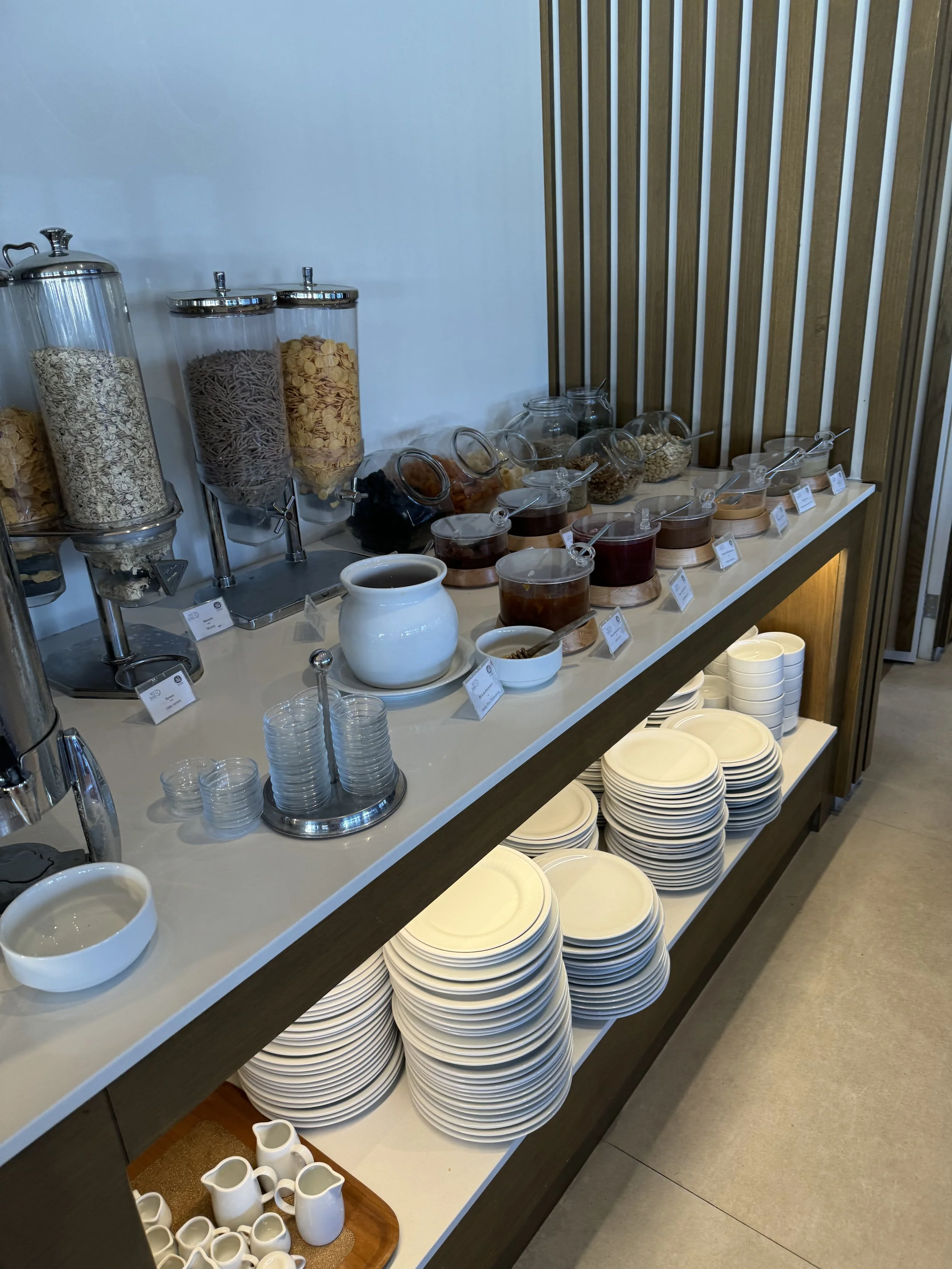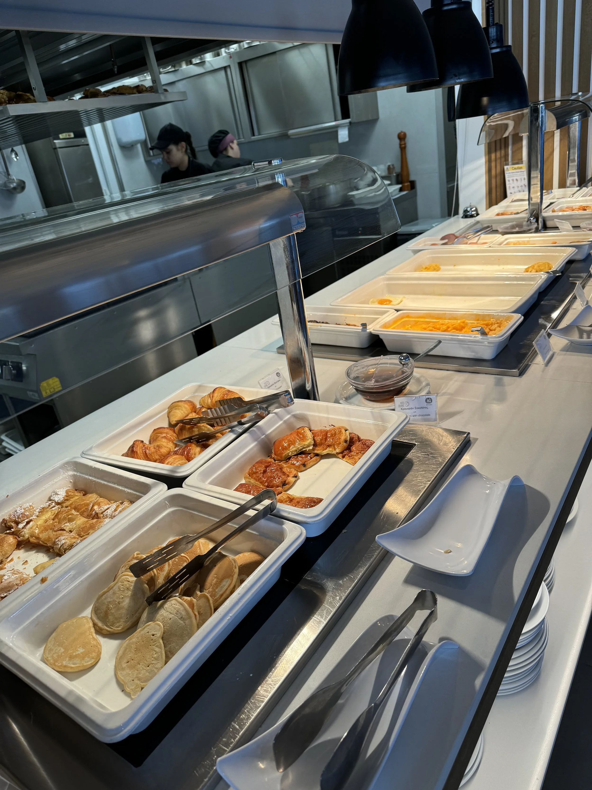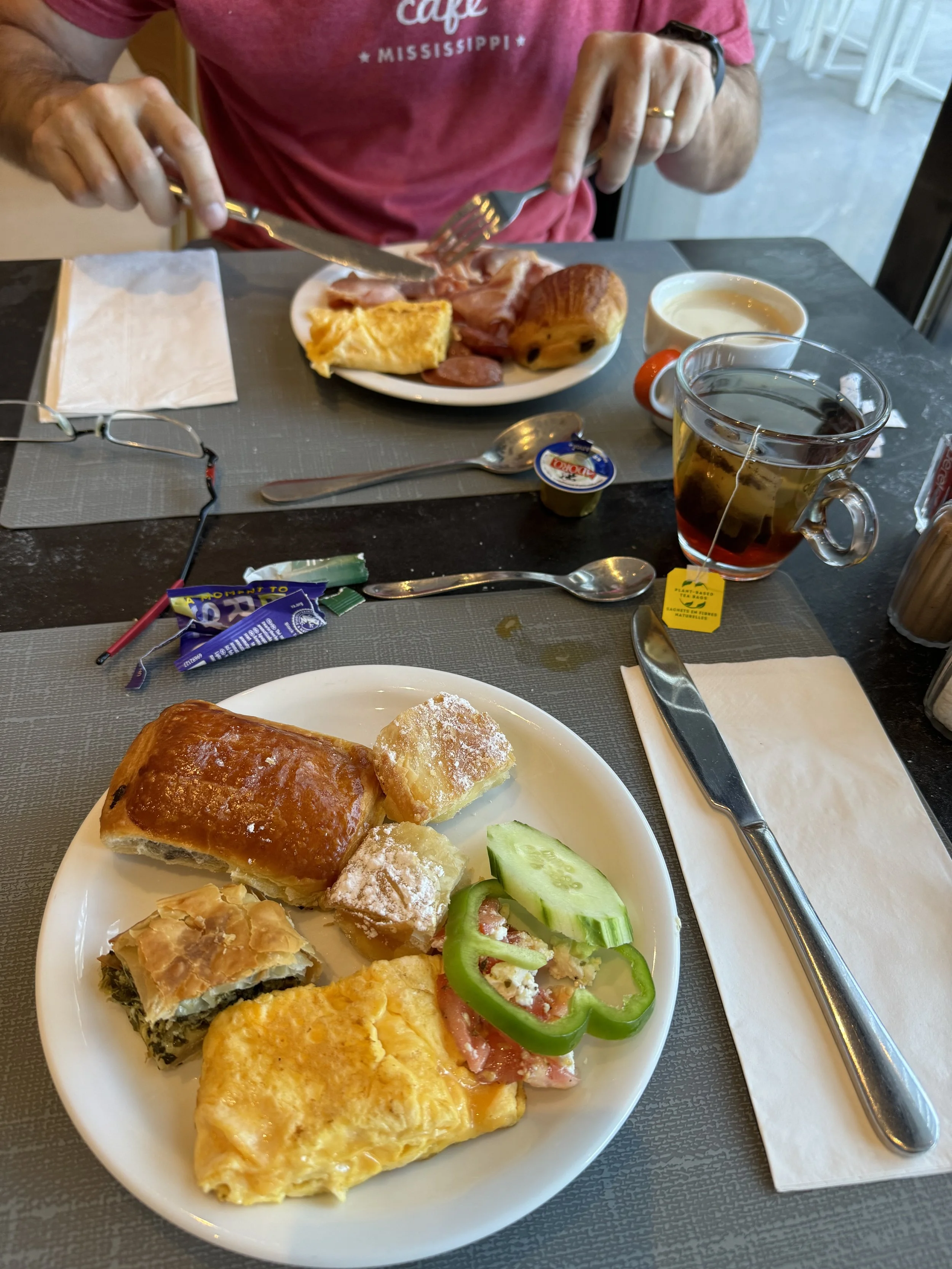 Cookies, cakes, fresh veggies and fruit, meats, omelets, eggs, fresh buttery croissants, chocolate pastry, bougatsa, (custard in buttery flaky fillo), tiropita, spanakopita (feta cheese and spinach pies made with buttery flaky fillo), rizogolo (rice pudding, not to mention cereals, yogurts, and an assortment of breads, muffins, and cakes. Wally said their coffee is better than what he gets back home, and I think the tea is too. The creamer/milk is so rich.