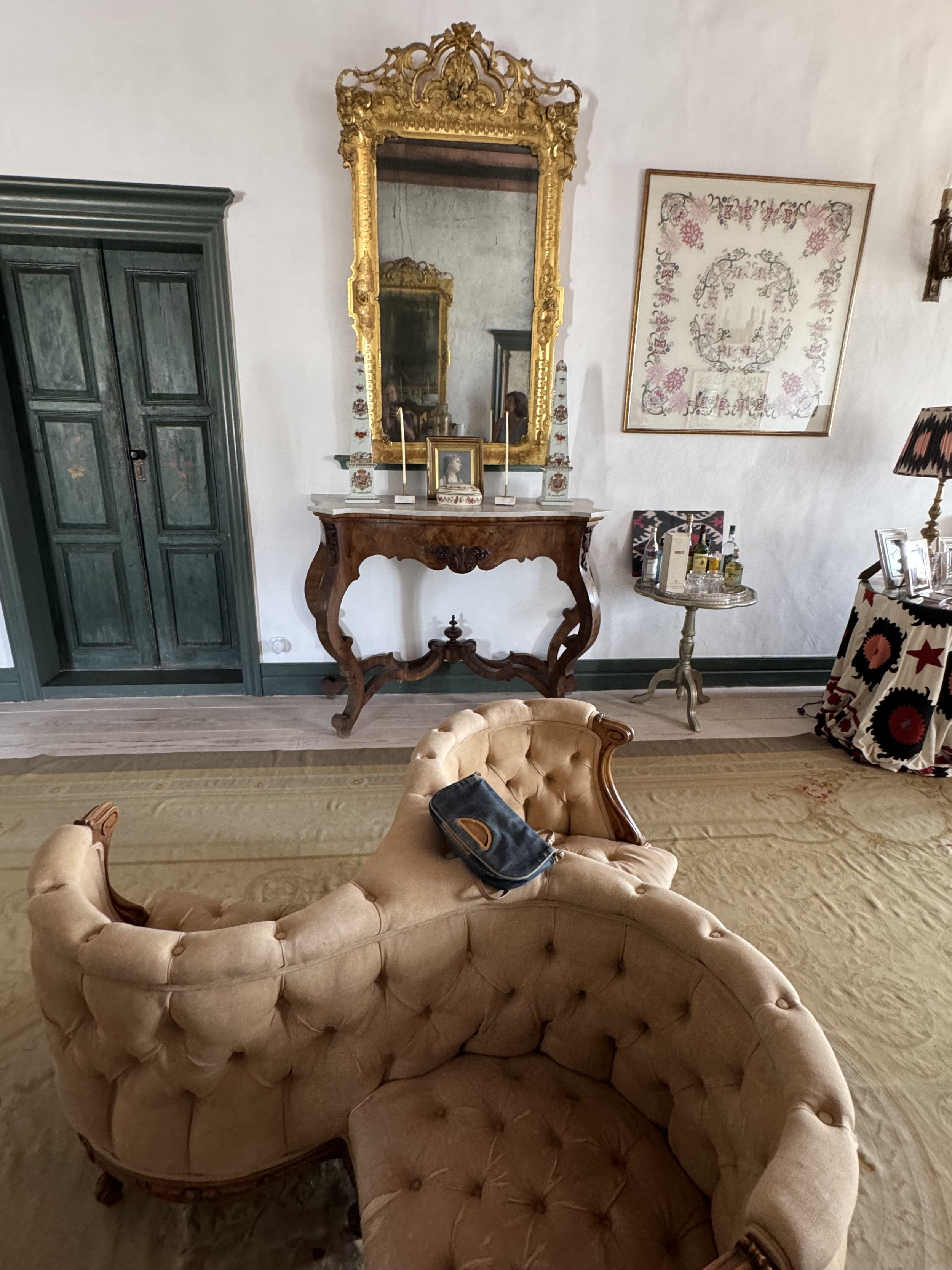 Two gold-framed mirrors face each other in the center of the room. They and the tables beneath them are original to the home.