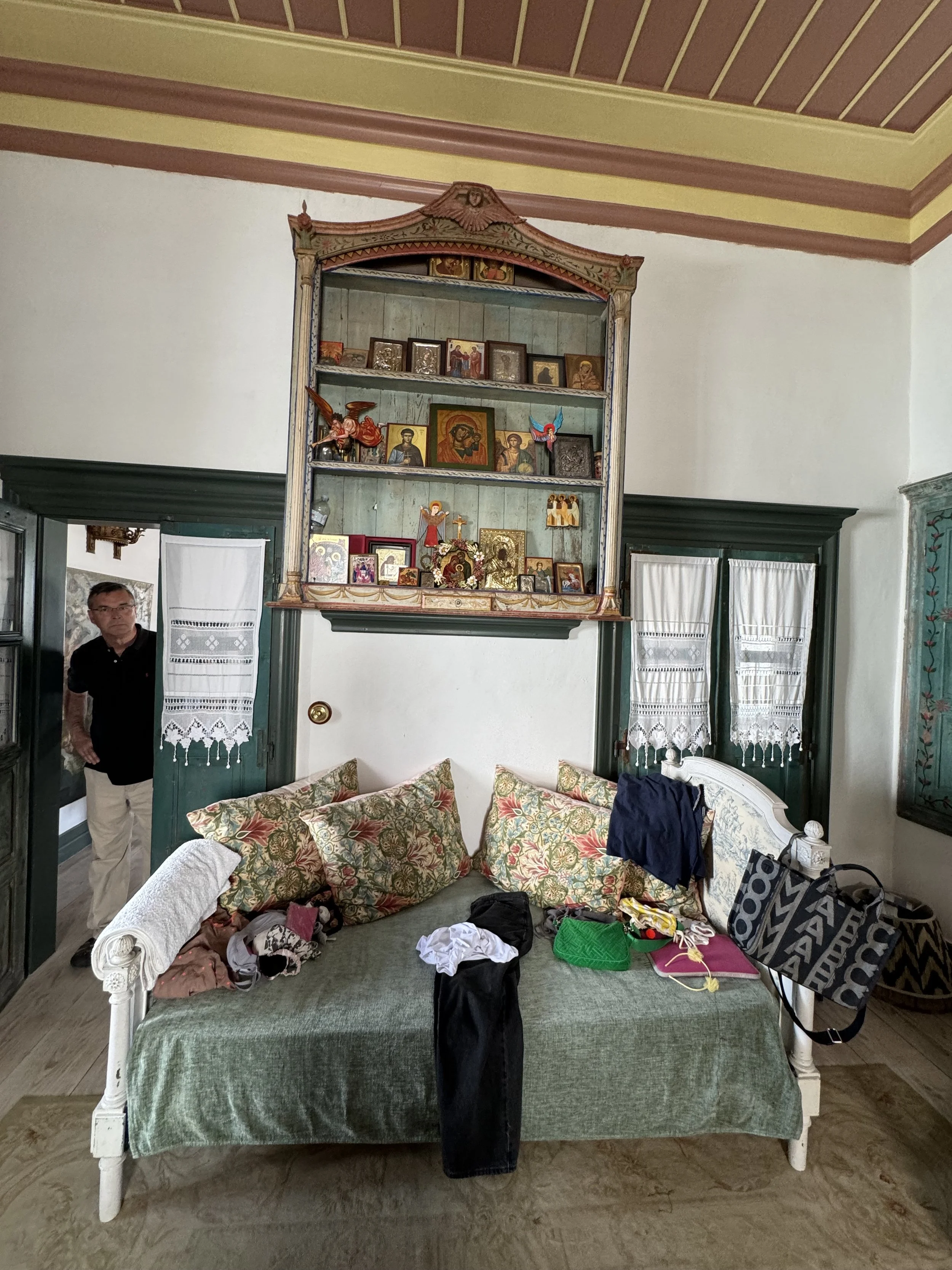 Facing the bed was a massive iconostasis. Most Orthodox Christians set up an icon station, or iconostasis, in their homes, which is a designated place for family worship, where morning and evening prayers are offered, and others as well. The one in Papouli’s family’s home is the biggest one I’ve ever seen in any home.