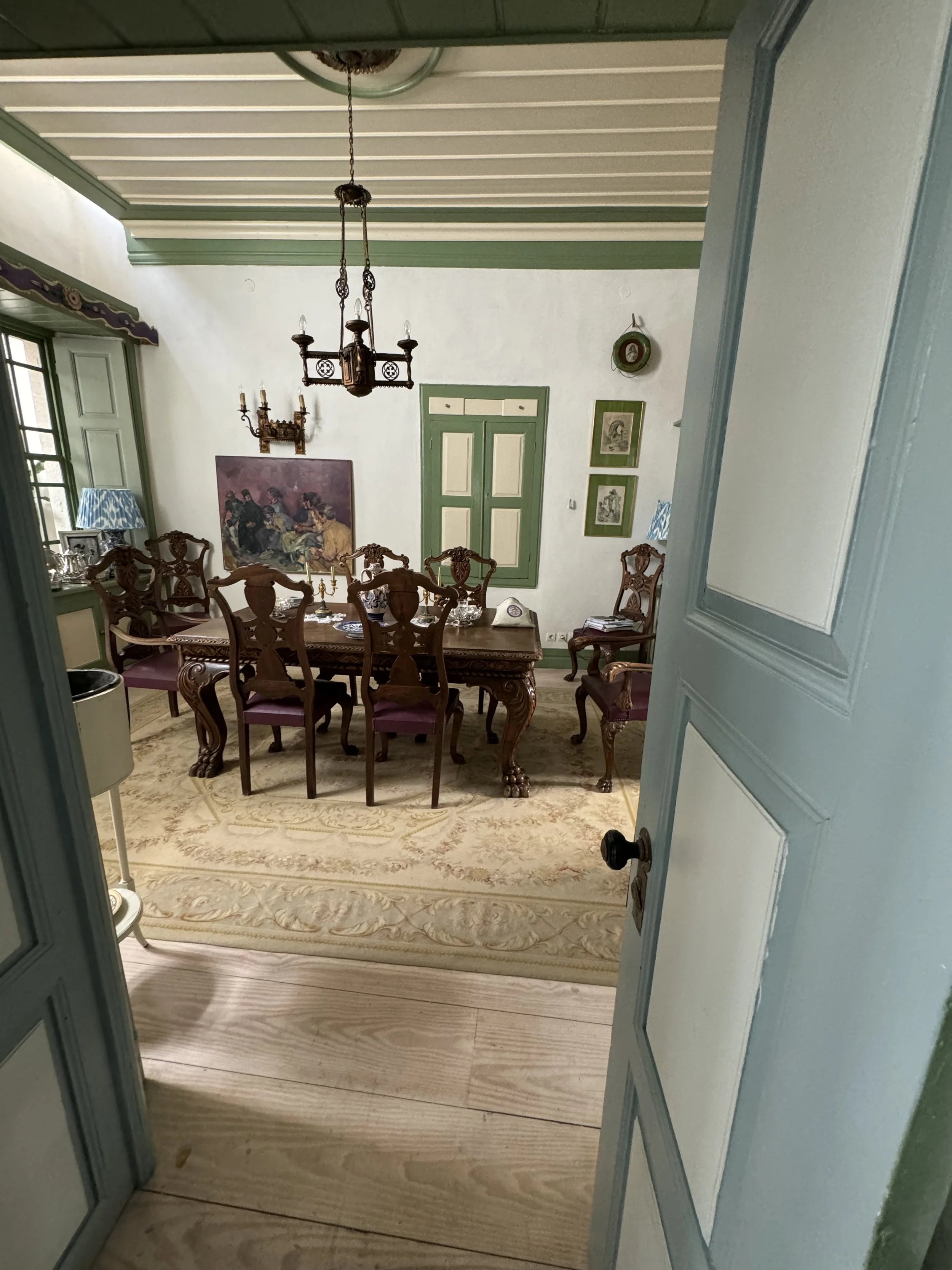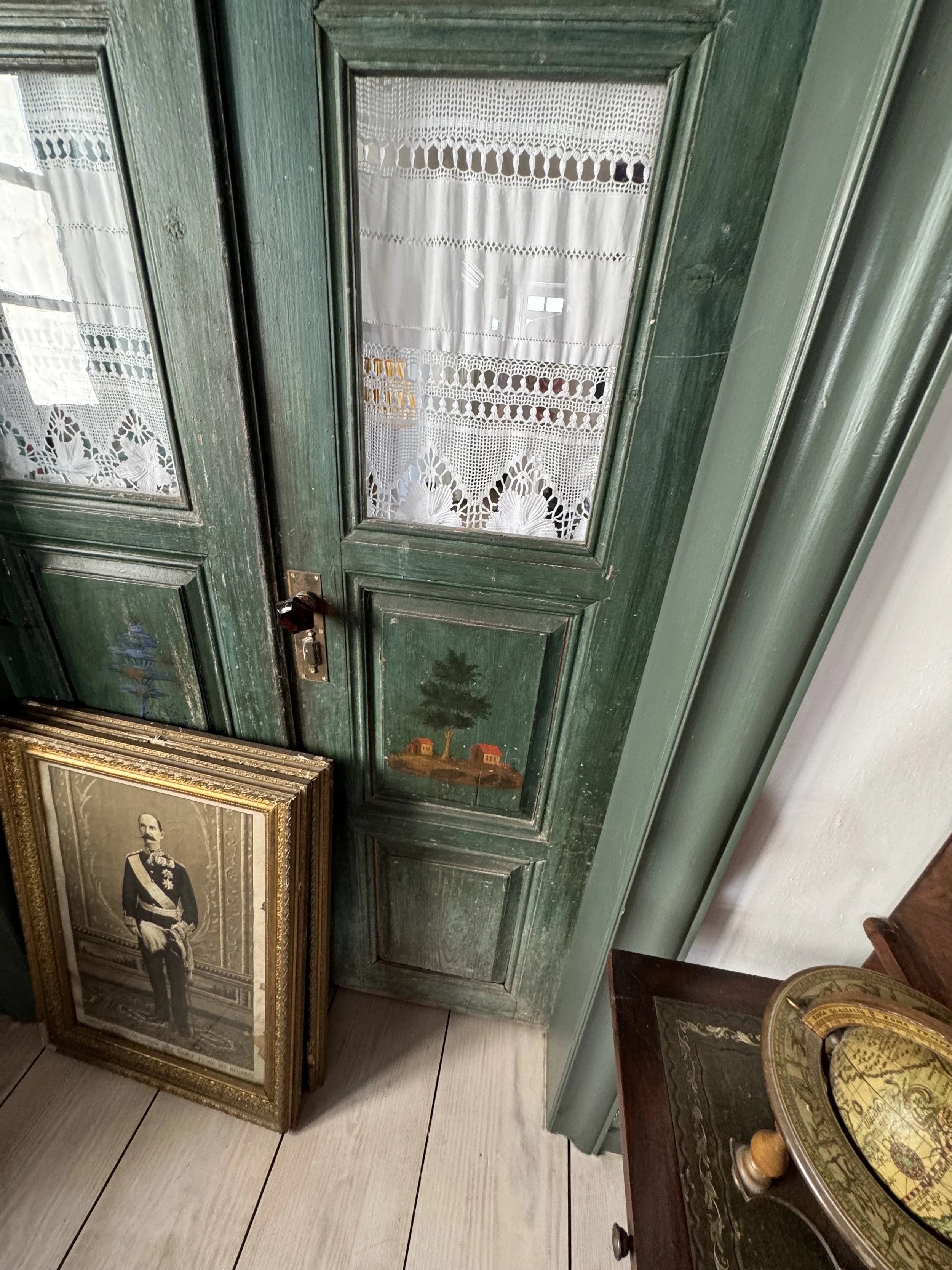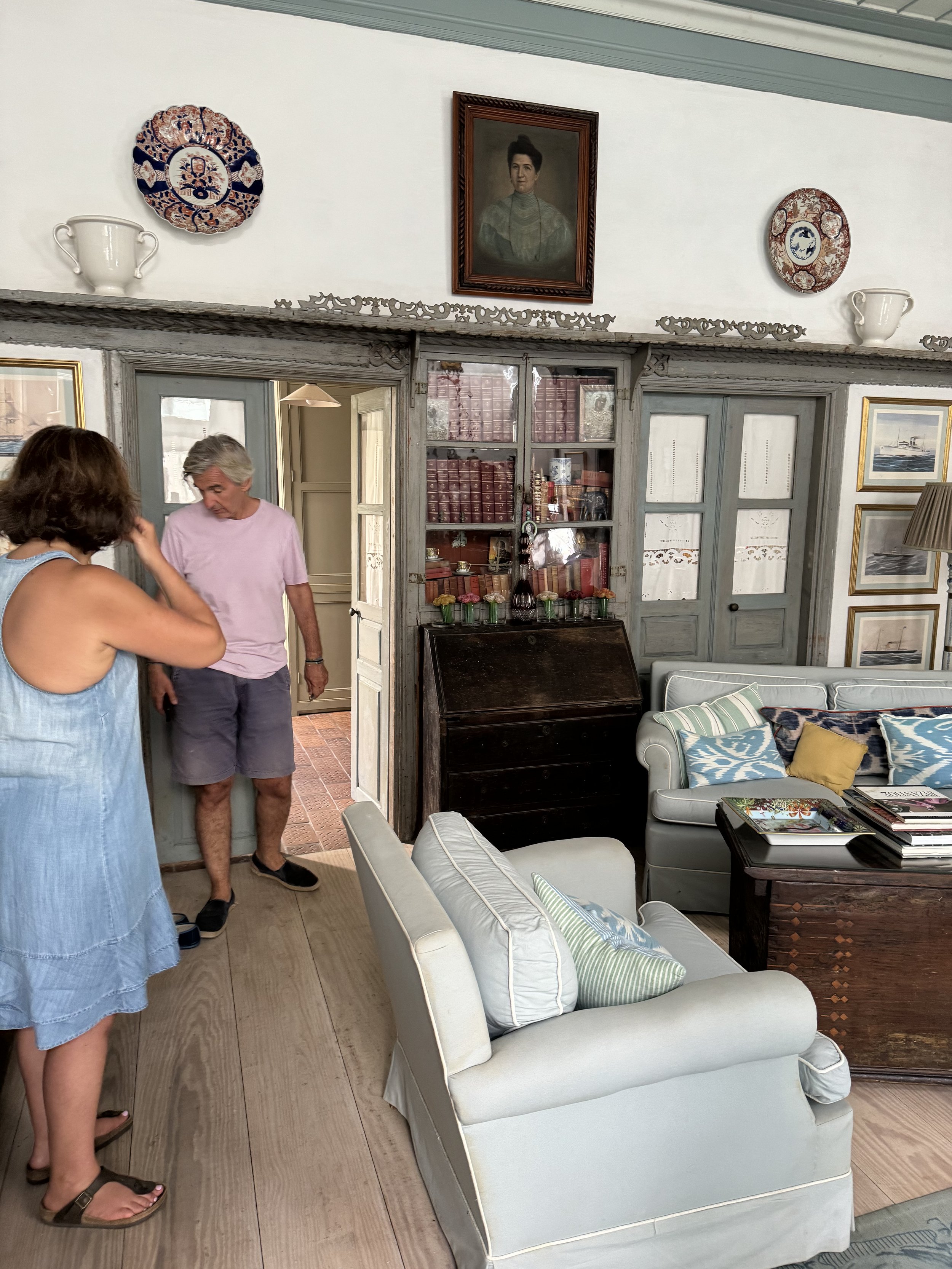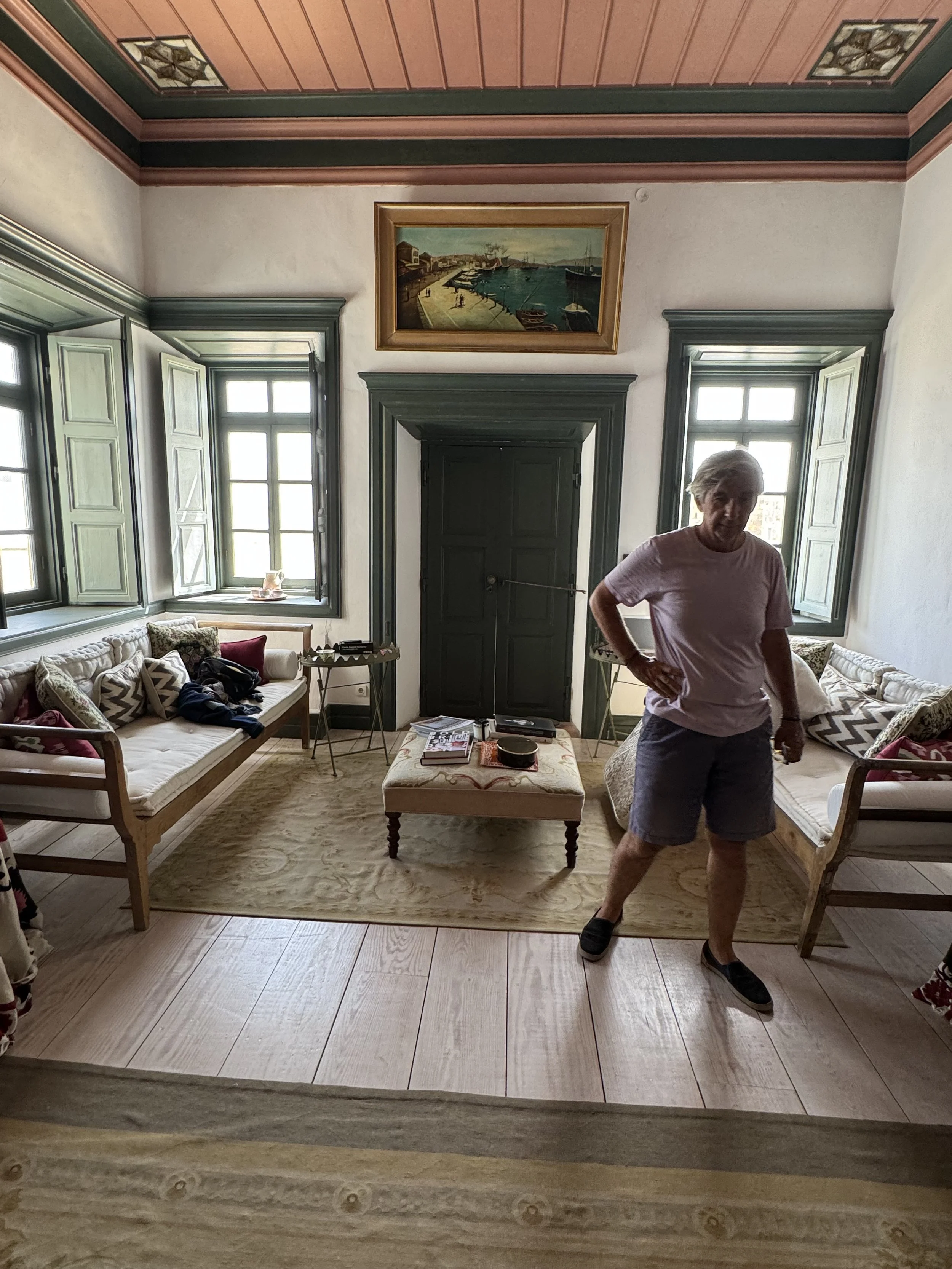 The entryway and sitting room led into a beautifully cozy living area. The portrait of the woman above the books is Calliope Alexakis Dorizas, my Papouli's grandmother. Nautical art decorated the walls and made me think of Vasili Moundreas, Melina’s grandfather, my Papouli’s brother-in-law, who was in shipping, but I forgot to ask if they were original. to the home.