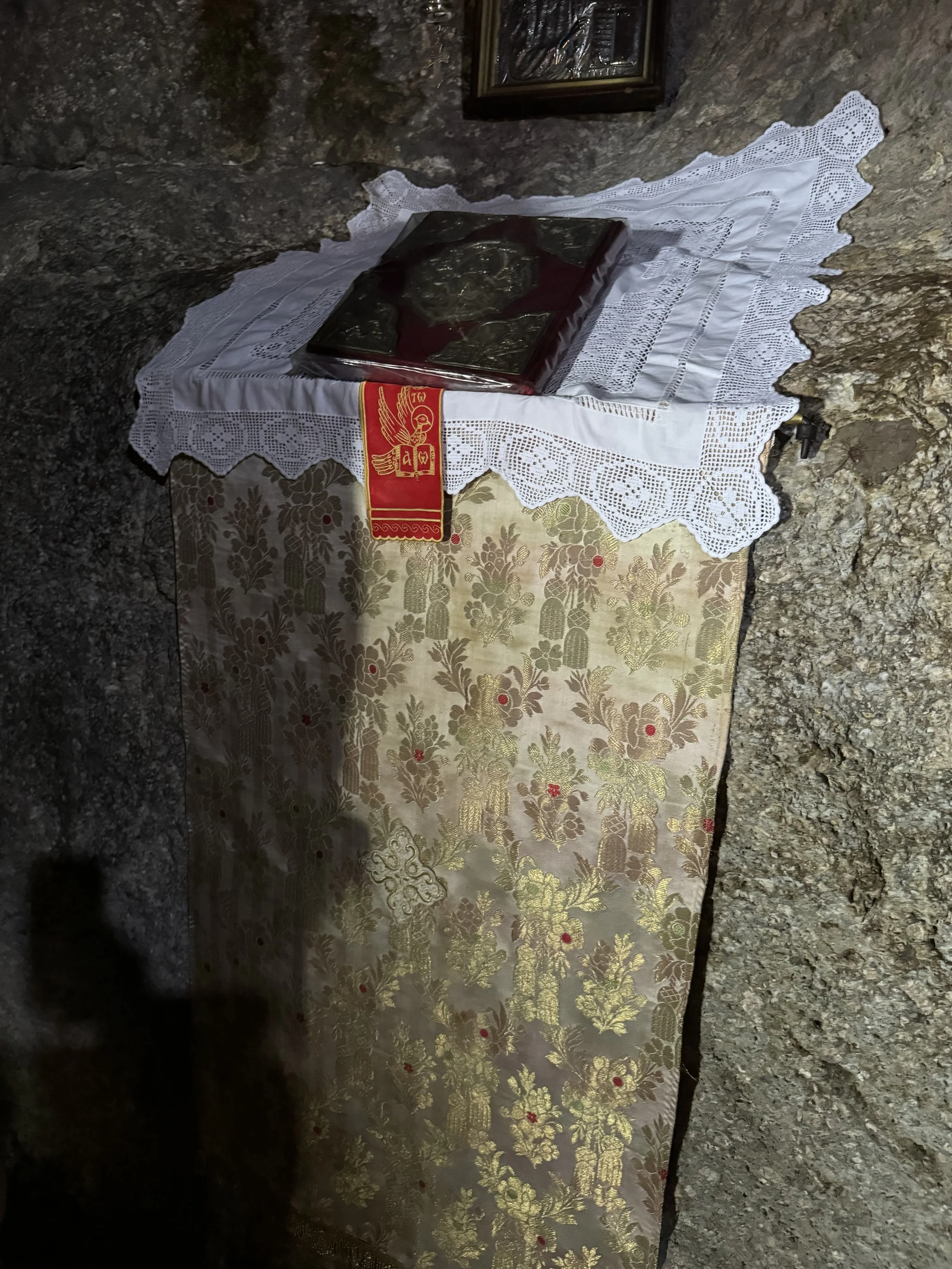 In the middle of the cave the ceiling is broken into three parts. Tradition teaches that when God spoke, His voice caused the crack, symbolizing that He is a Trinity.