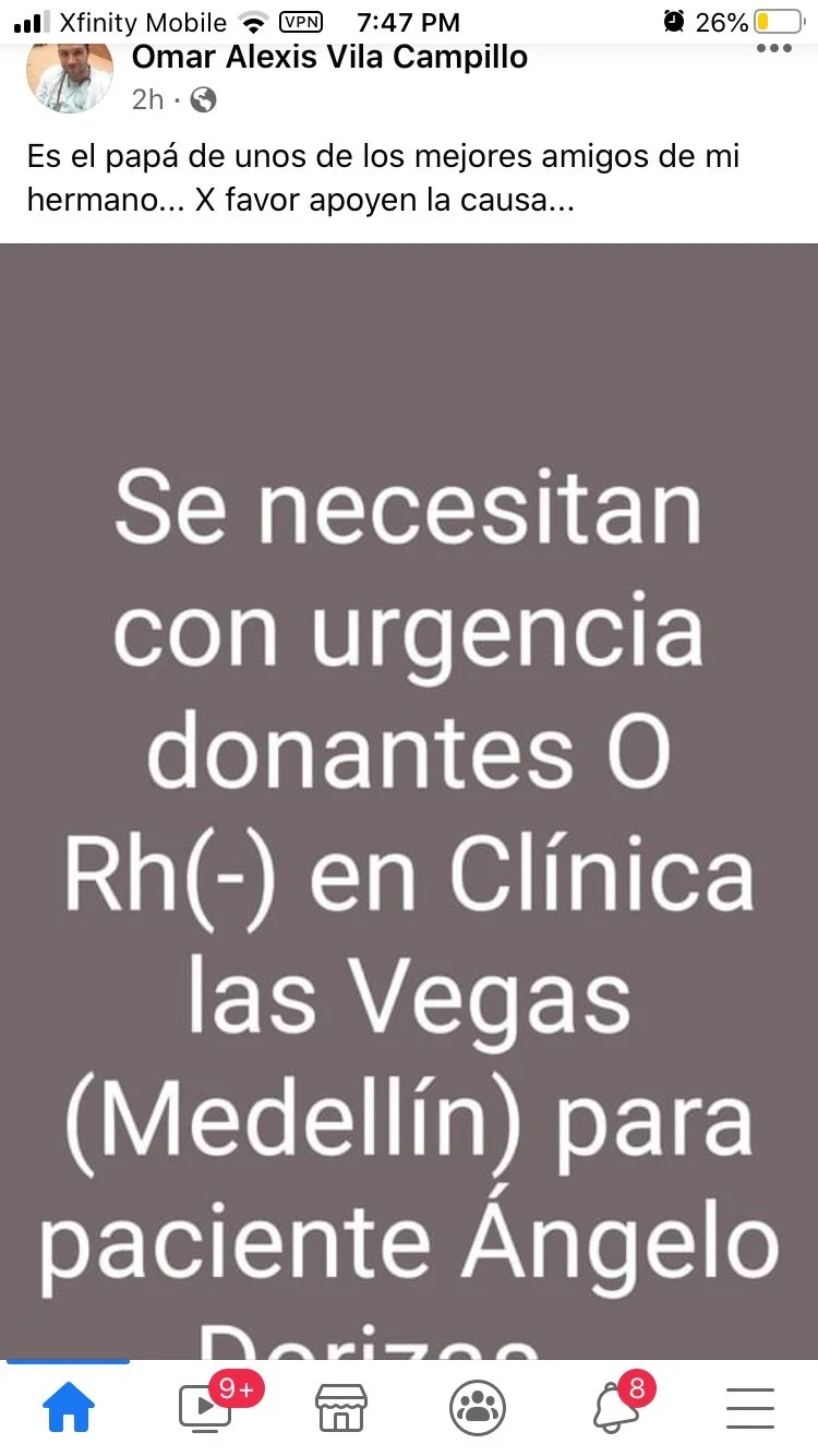 Having the same blood type, I asked Jad if he thought I should go to Colombia, and he said he had 11 surgeries scheduled that week and thought about clearing his schedule and going himself, but a couple of patients were in really bad shape and he hated to do that to them. If I would go, it would really set his mind at ease. He would pay for the ticket.